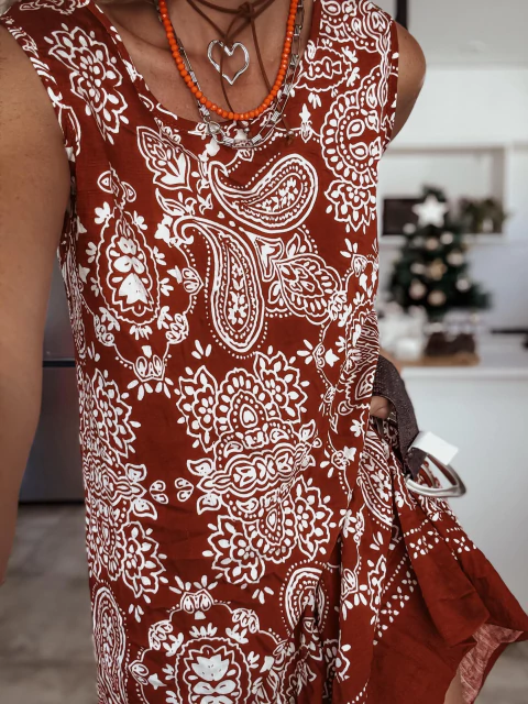 Descubrí el Vestido sin mangas con estampado, ideal para esta temporada. Confeccionado en tela liviana y fresca, es perfecto para los días cálidos y actividades al aire libre. Su diseño sin mangas y estampado moderno aportan un toque de estilo y comodidad.